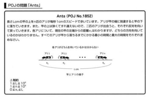 今回のお題はこちら。 これは蟻がぶつかったときにお互い影響なくすり抜けたと見なしても問題ないことに気付けるかどうかがポイントですね。俺はわかりませんでした。。 L = 10 #input $ants = [2, 6, 7] #input $minTime = 2147483647 $maxTime = 0 $ants.e…